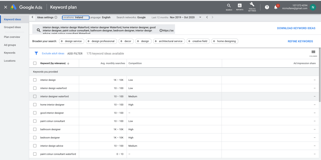 I started my keyword research focusing on the south-east area – Waterford, Kilkenny and Wexford – but found that search volume is very low and some competition data is not available due to low numbers. So I expanded my location to the whole of Ireland as Anita also offers online consultation services.